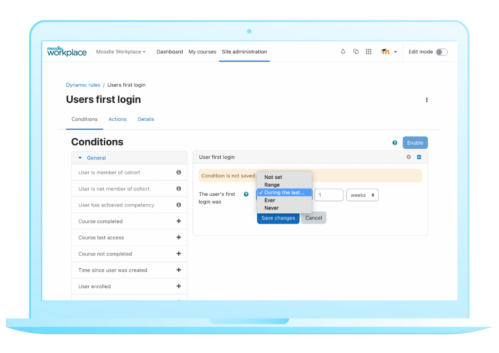The Dynamic Rules feature, a set of conditions and actions that you can use to automate your work, has been improved so that it now triggers automated actions on a learner’s first login which enhances the employee onboarding software experience.