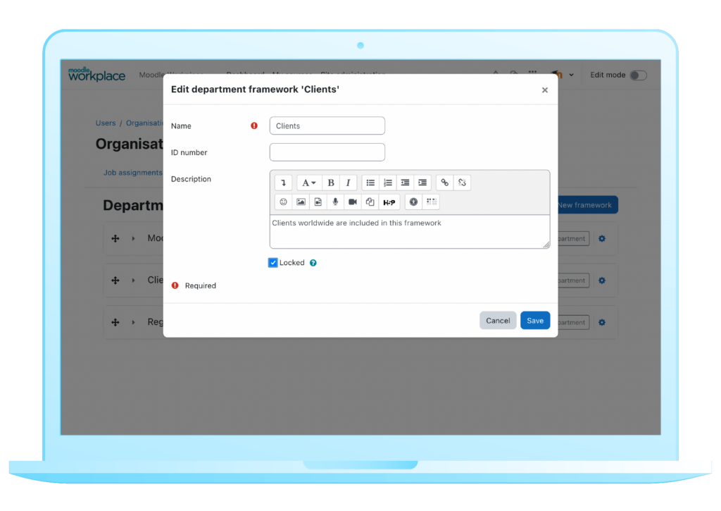 A new setting that allows for the locking of shared department and position frameworks ensures that only trainers with the right permissions can manage jobs related to locked departments and position frameworks. By enabling trainers or admins  to lock some departments, teams, or position frameworks, organisational security is improved, as only authorised individuals or teams can have access.